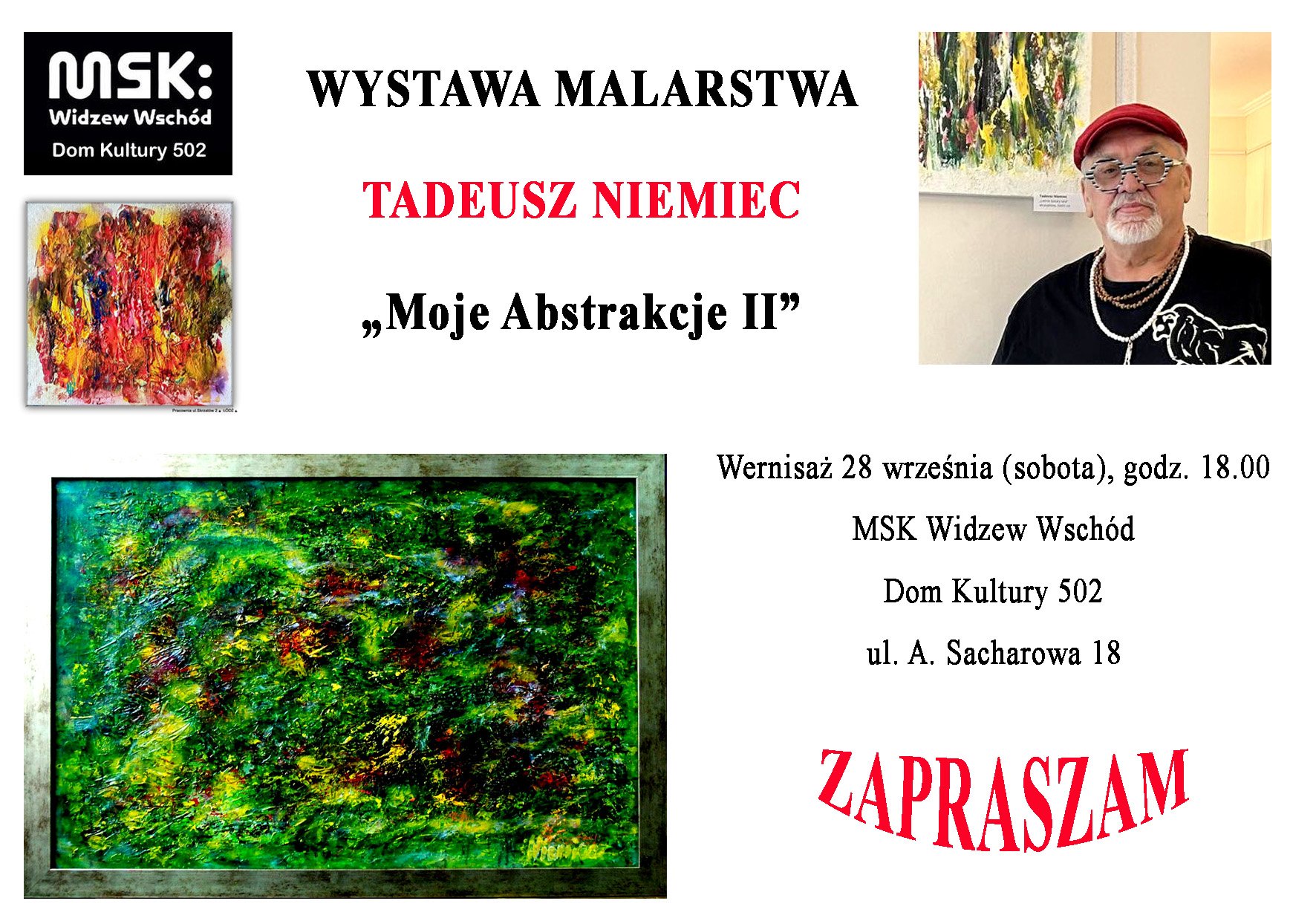 Serdecznie zapraszamy na wernisaż wystawy Tadeusza Niemca pt. "Moje abstrakcje II", który odbędzie się 28 września br. w łódzkim domu kultury MKS Widzew Wschód.